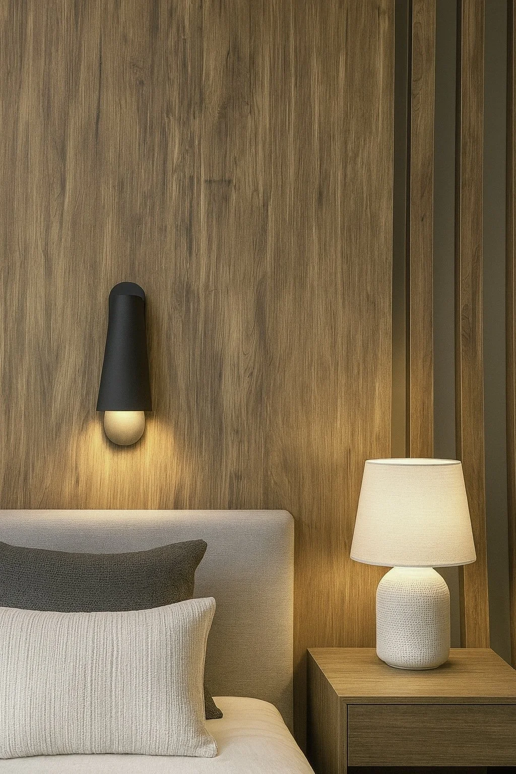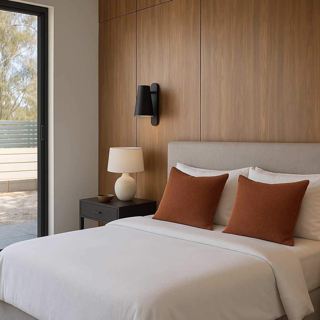 Muted tones, organic textures and natural materials chosen in the main bedroom and ensuites create a timeless connection between the indoors and the outdoors.