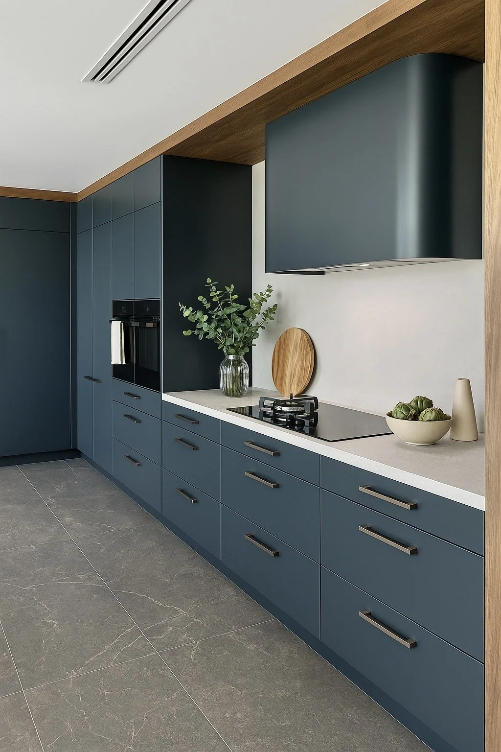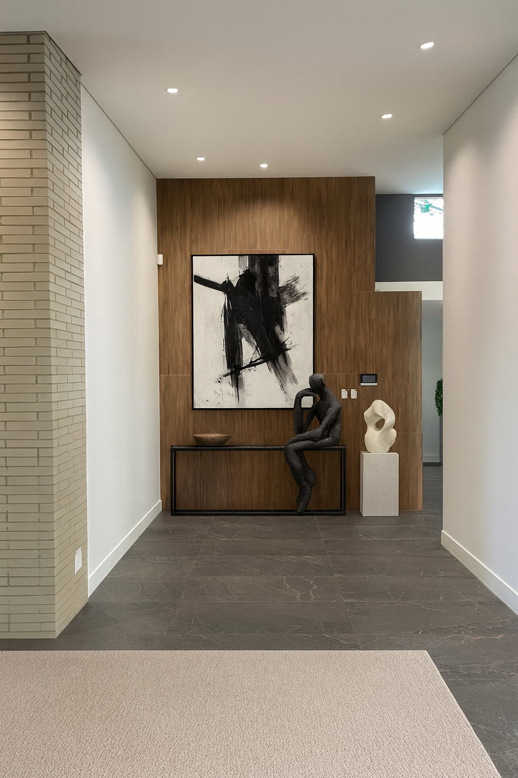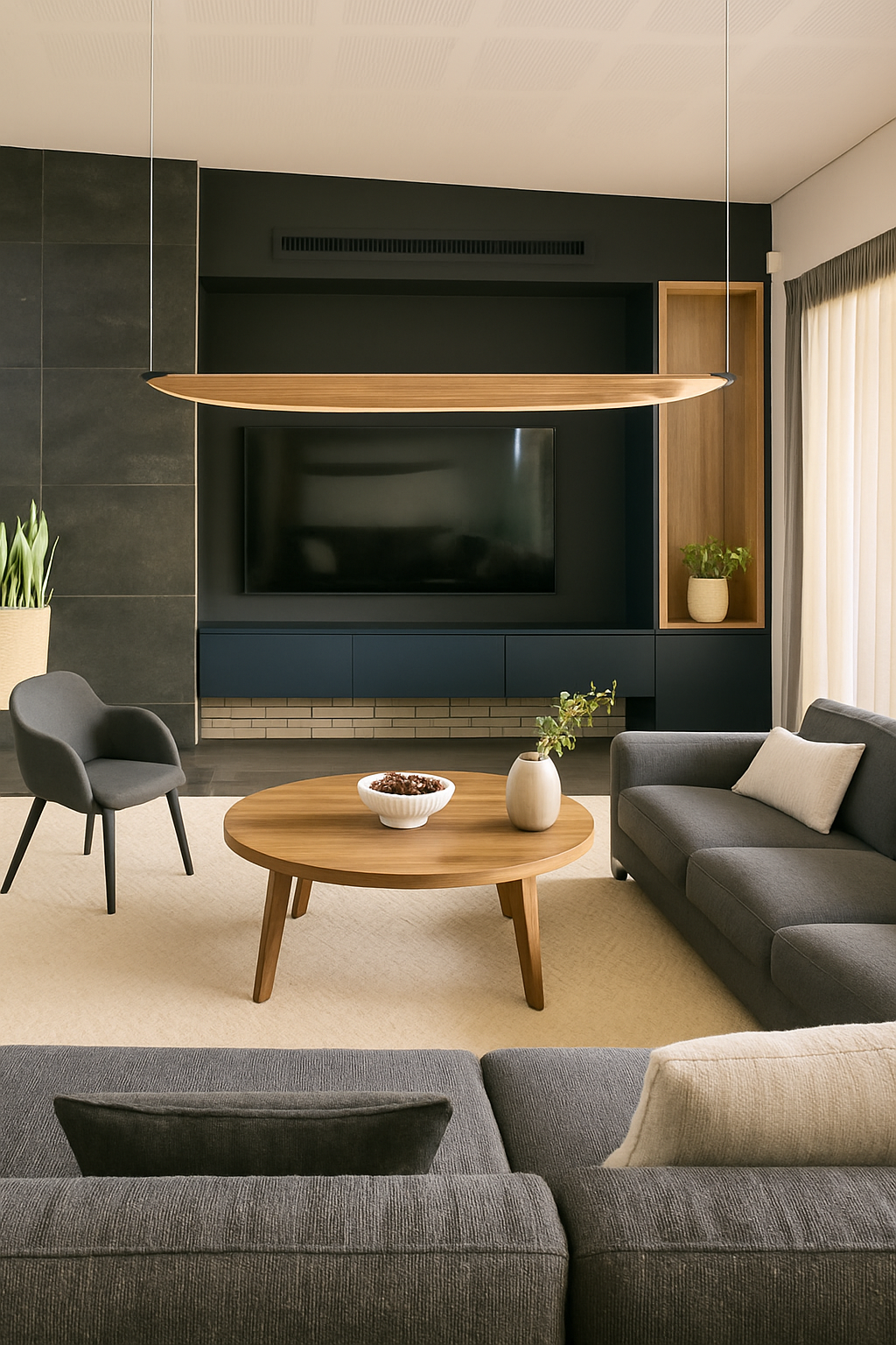 The large-scale design features impressive open spaces, high ceilings, and durable materials that emphasize functionality while maintaining a sleek, refined aesthetic. Deep moody tones are balanced with warm natural textures, creating a space that feels both tasteful and inviting.
